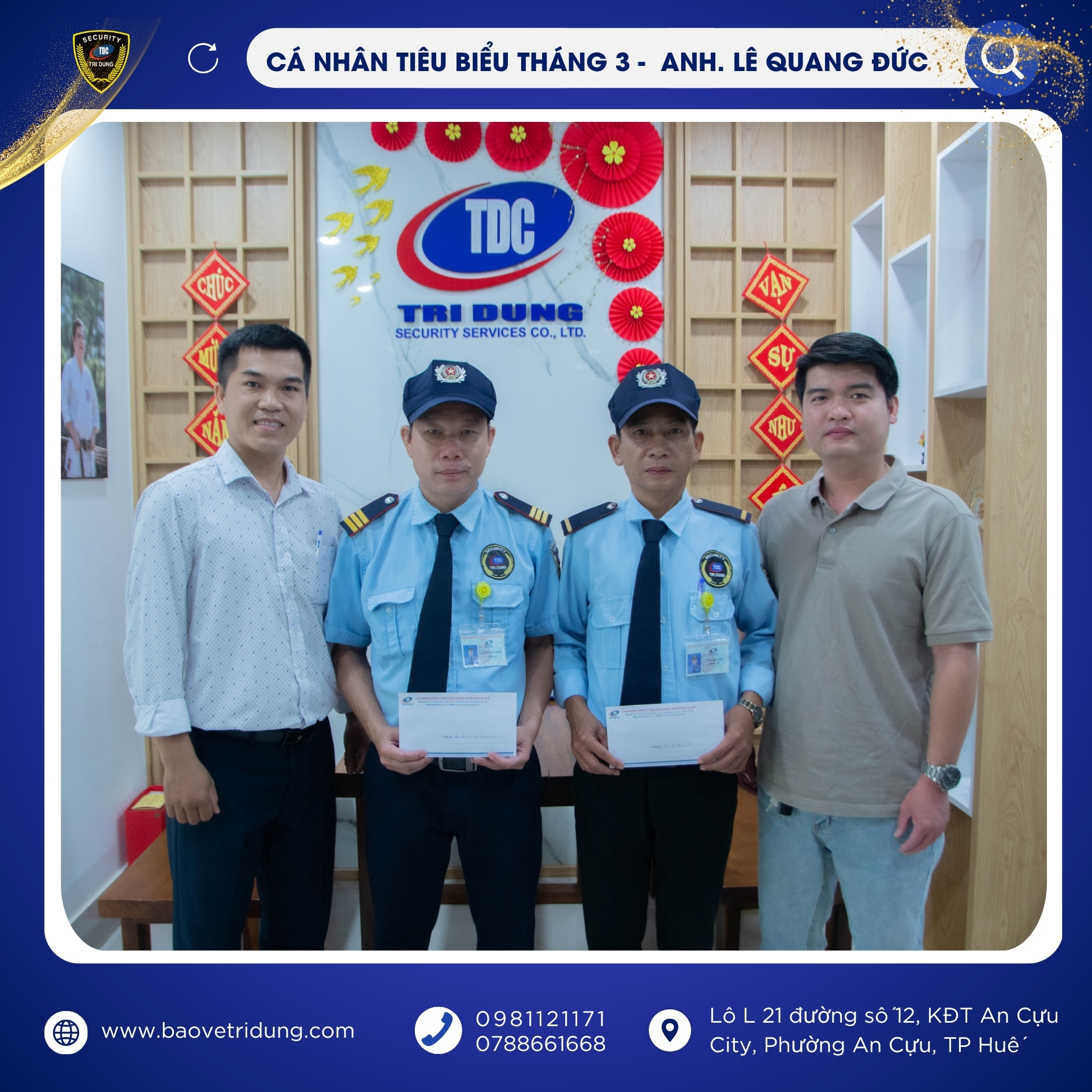 Chi nhánh Công ty Bảo vệ Trí Dũng tại Huế xin chúc mừng các tập thể, cá nhân được tuyên dương và tin tưởng rằng trong thời gian tới sẽ tiếp tục phát huy tinh thần trách nhiệm, giữ vững phong độ, hoàn thành xuất sắc mọi nhiệm vụ được giao.